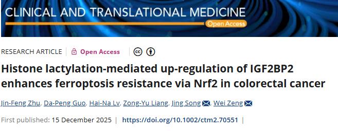 近日,华南理工大学附属第六医院研究团队在期刊《Clinical And Translational Medicine》上发表了研究论文,题为“Histone lactylation-mediated up-regulation of IGF2BP2 enhances ferroptosis resistance via Nrf2 in colorectal cancer”,研究结果表明,在结直肠癌细胞和肿瘤相关巨噬细胞中,乳酸通过组蛋白 H3K18la 介导的转录激活上调 IGF2BP2。IGF2BP2 水平升高直接与 Nrf2 mRNA 结合并使其稳定,从而提高 Nrf2 水平,增强结直肠癌细胞对铁死亡的抵抗能力。值得注意的是,这种乳酸 - IGF2BP2 - Nrf2 轴还促进了 M2 巨噬细胞极化,营造了免疫抑制的肿瘤微环境(TME)。在异种移植模型中,乳酸驱动的 Nrf2 上调加速了结直肠癌肿瘤的生长和转移。相反,用二氯乙酸(DCA)抑制铁死亡抵抗或耗尽 IGF2BP2 显著降低了肿瘤负荷。