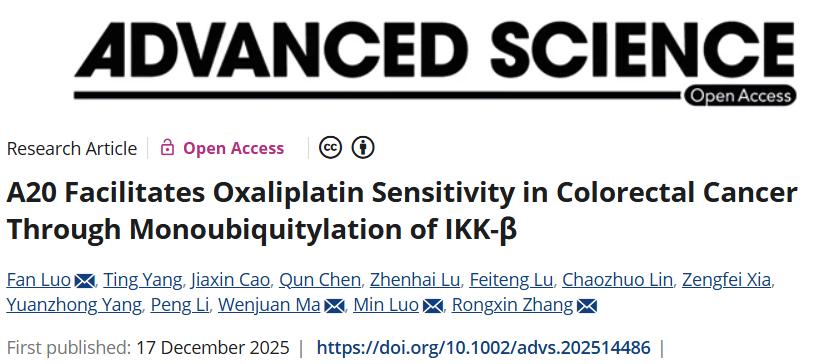 近日,中山大学研究团队在期刊《Advanced Science》上发表了研究论文,题为“A20 Facilitates Oxaliplatin Sensitivity in Colorectal Cancer Through Monoubiquitylation of IKK-β”,本研究中,研究人员在局部晚期 CRC 患者中开展了一项前瞻性、随机的 III 期研究,患者接受奥沙利铂+卡培他滨新辅助放化疗或仅卡培他滨新辅助放化疗。通过免疫组化对术前活检和匹配的手术标本进行评估,以确定 A20 与奥沙利铂反应之间的关联。在奥沙利铂-NACRT 组中,达到病理完全缓解(pCR)的患者 A20 表达低于非 pCR 患者,而在非奥沙利铂-NACRT 组中未观察到差异。另外两个独立队列证实了人类 CRC 组织中 A20 的下调,且 A20 表达降低与较差的生存率和奥沙利铂耐药性相关。A20 敲低或表达 IKK-β K163R 突变体在小鼠异种移植模型中诱导奥沙利铂耐药性。在临床上,A20 的表达与 IKK-β 及其下游靶点呈负相关。A20 的缺失通过稳定 IKK-β 促进结直肠癌对奥沙利铂的耐药性。这些结果揭示了 A20-IKK-β 轴在结直肠癌对奥沙利铂耐药性中的关键作用。