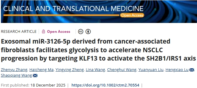 近日,潍坊市人民医院研究团队在期刊《Clinical And Translational Medicine》上发表了研究论文,题为“Exosomal miR-3126-5p derived from cancer-associated fibroblasts facilitates glycolysis to accelerate NSCLC progression by targeting KLF13 to activate the SH2B1/IRS1 axis”,本研究中,癌相关成纤维细胞(CAFs)来源的外泌体 miR-3126-5p 在非小细胞肺癌(NSCLC)组织中高表达,其血浆水平升高与 NSCLC 患者的不良预后显著相关。CAFs 来源的外泌体 miR-3126-5p 促进糖酵解,从而加速 NSCLC 细胞的恶性进展。KLF13 在 NSCLC 中表达降低,而其过表达通过抑制糖酵解来抑制 NSCLC 的生长。外泌体 miR-3126-5p 通过靶向 KLF13 的 3′-UTR 来抑制其在 NSCLC 细胞中的表达。KLF13 转录抑制 SH2B1 的表达,从而消除 SH2B1 与 IRS1 蛋白之间的相互作用,从而抑制 PI3K/AKT 通路介导的糖酵解。KLF13 敲低抵消了外泌体 miR-3126-5p 抑制的抗癌作用。研究结果表明,CAF 分泌的外泌体 miR-3126-5p 是一种在非小细胞肺癌治疗中具有潜力的新型干预手段。