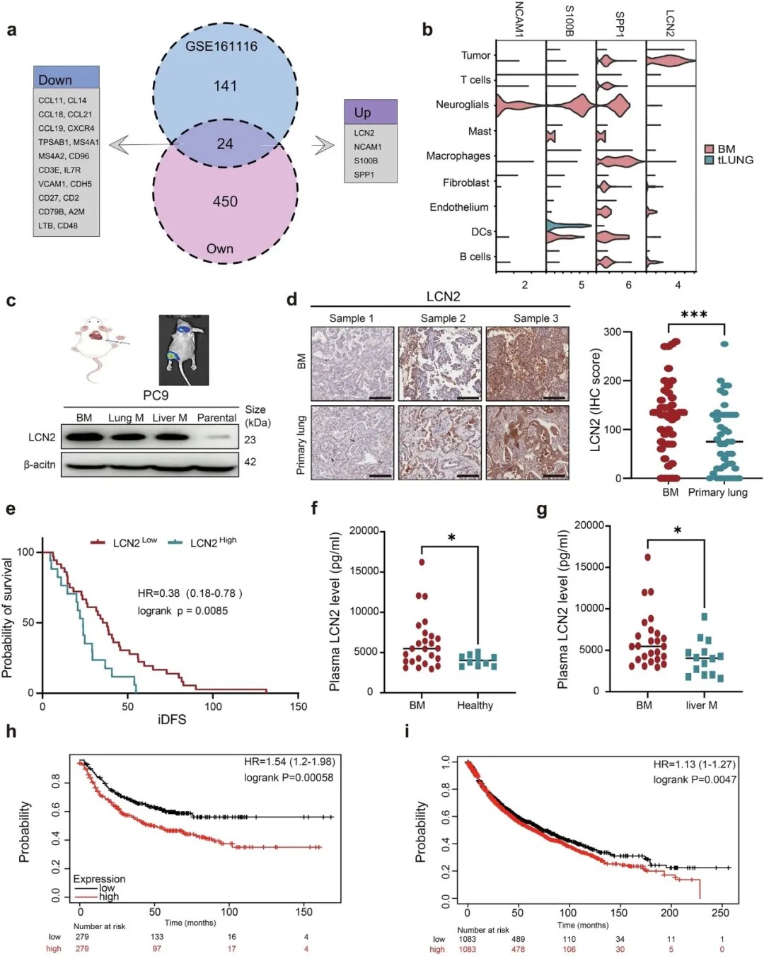 研究团队通过对比肺癌原发灶和脑转移灶的基因表达谱,发现LCN2在脑转移灶中显著上调。临床数据分析进一步证实,LCN2高表达的肺癌患者预后明显较差。