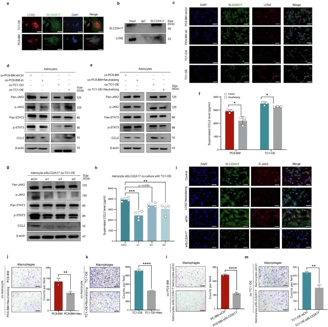 在机制上,肿瘤细胞分泌的LCN2与脑内的星形胶质细胞上的受体SLC22A17结合,激活JAK2/STAT3信号通路,诱导星形胶质细胞活化并分泌趋化因子,进而招募巨噬细胞聚集。