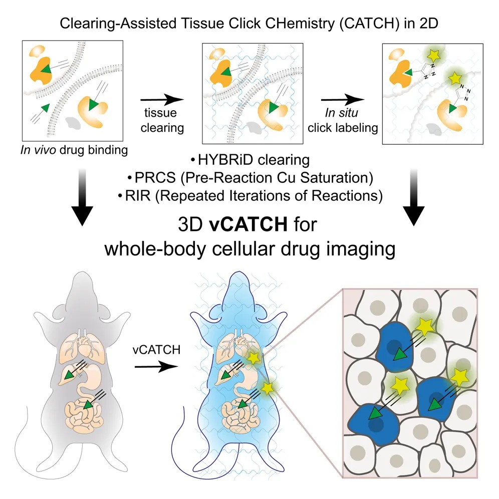 近日,国际知名期刊《Cell》发表一项名为vCATCH(体积透明辅助组织点击化学) 的重磅新技术,成功实现了在哺乳动物全身范围内对共价药物作用靶点进行单细胞分辨率的精确测绘。该技术通过改进点击化学反应条件,克服了大型组织样本中药物成像的深度和均匀性难题,为理解药物疗效和毒性机制提供了全新视角。