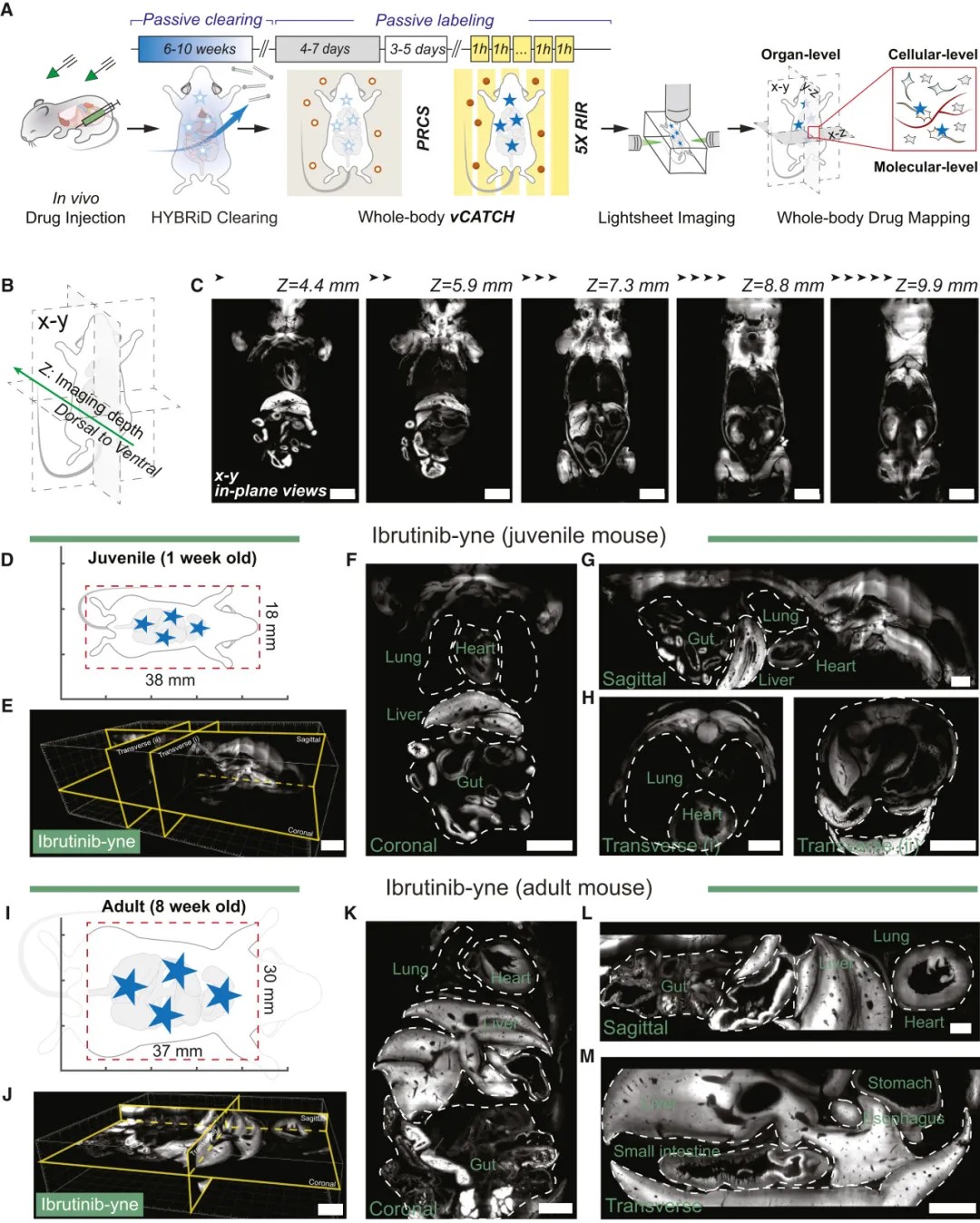 传统方法难以精确显示药物在体内的具体作用位点,通常只能提供器官水平的粗略分布信息。vCATCH技术的创新之处在于引入了预反应铜饱和(PRCS) 和重复迭代反应(RIR) 策略。前者通过饱和组织中的铜结合位点确保点击化学反应深度,后者通过多次刷新反应混合物实现均匀标记。研究团队通过对小鼠全身进行vCATCH处理,结合HYBRiD组织透明化和光片荧光显微镜成像,首次清晰呈现出抗癌药物阿法替尼(afatinib)和伊布替尼(ibrutinib)在动物体内的精细分布图谱。