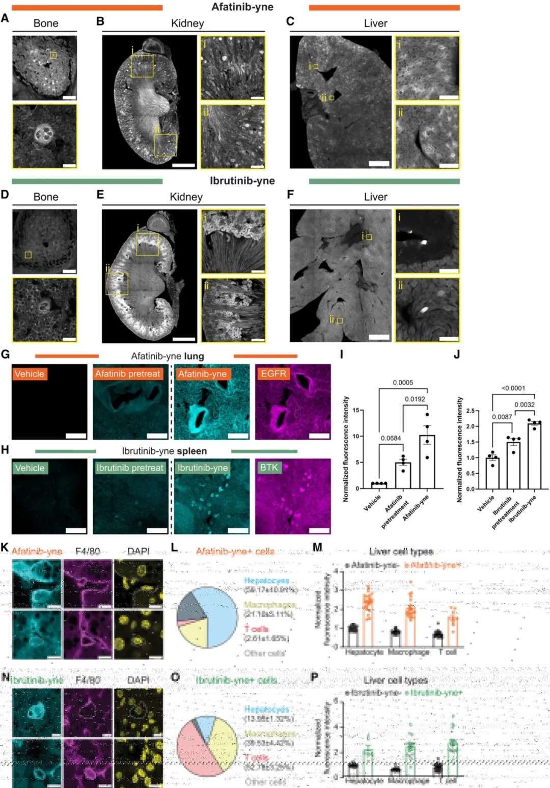 应用vCATCH技术,研究人员不仅验证了两种药物在预期靶器官(如肺、脾)的富集,还发现了可能与副作用相关的未知结合位点。例如,伊布替尼除在血液细胞中结合外,还在肝脏、心脏组织和血管的免疫细胞上显示结合信号,这为其可能引起心律失常和出血的副作用提供了直接线索。此外,在肝脏中,阿法替尼主要与肝细胞结合,而伊布替尼则更多结合巨噬细胞和T细胞,提示二者在同一器官内作用细胞类型的差异。