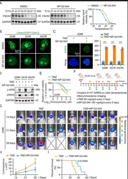 为了探究替莫唑胺(TMZ)联合疗法的潜在临床应用,研究人员选用了目前处于临床试验阶段的 FSCN1 抑制剂 NP-G2-044,其主要靶向肿瘤侵袭和转移的作用。研究人员进行了细胞热位移分析(CETSA),蛋白质印迹及免疫荧光染色实验。蛋白质印迹结果表明,在替莫唑胺耐药的 GBM 细胞中,替莫唑胺与 NP-G2-044 联合处理显著提高了 DNA 损伤标志物蛋白的水平,相比单独使用替莫唑胺处理。CCK8 细胞活力测定表明,替莫唑胺与 NP-G2-044 联合处理显著抑制了替莫唑胺耐药的 GBM 细胞的增殖活性。为了评估 NP-G2-044 对替莫唑胺耐药性的体内影响,研究人员使用替莫唑胺耐药的 229R 细胞系建立了小鼠原位 GBM 异种移植模型。总之,这些发现表明替莫唑胺与 NP-G2-044 的联合使用可能是克服替莫唑胺耐药性并提高治疗效果的一种有前景的策略。