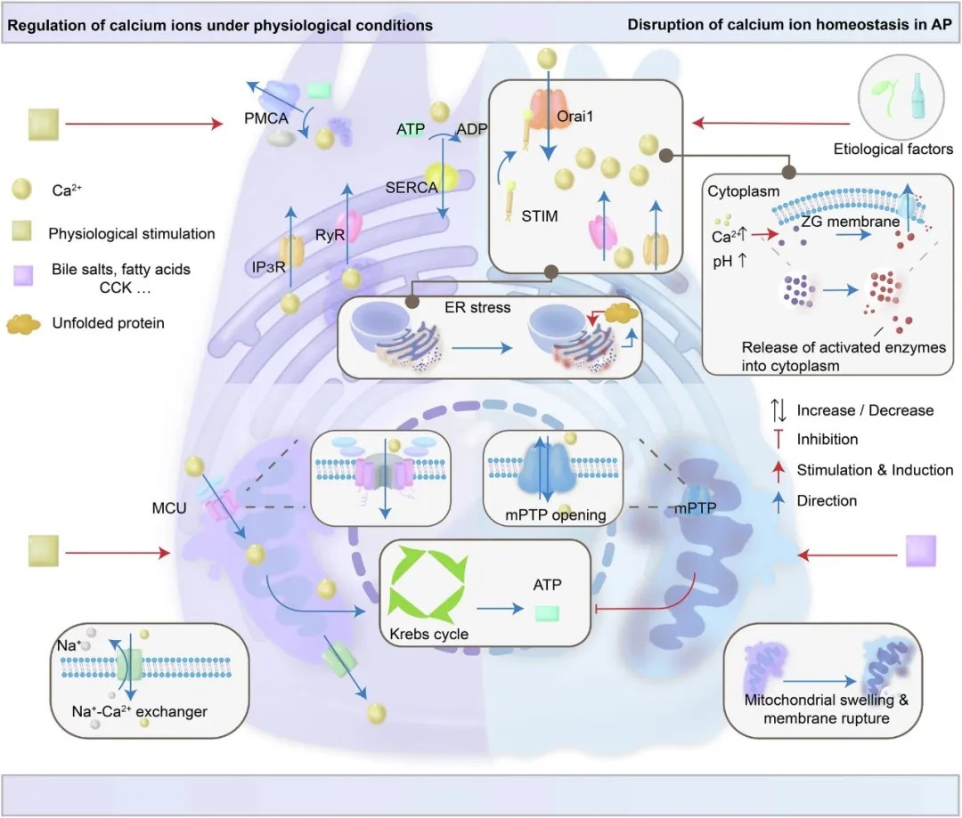 钙信号紊乱:内质网钙释放和线粒体钙摄取失调导致钙超载,引发腺泡细胞坏死、代谢应激及炎症放大。