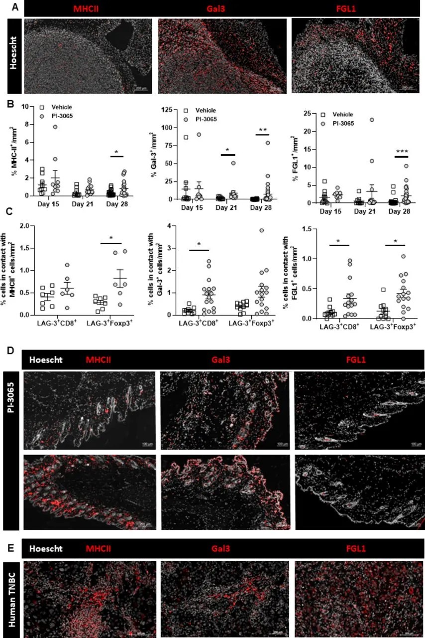 在肿瘤接种后的不同时间点,研究人员对未经治疗和接受 PI-3065 治疗的小鼠肿瘤中 MHCII、Gal-3 和 FGL1 的表达水平进行了检测。Gal-3 在肿瘤微环境(TME)中的表达水平最高,分布于肿瘤内部深处和周边。FGL1 阳性细胞往往靠近肿瘤边缘,而 MHCII 在整个肿瘤微环境中的表达水平较低。配体表达水平的定量分析表明,PI-3065 治疗促进了这三种配体的表达,这种现象在肿瘤接种后第 28 天尤为明显。为了确定肿瘤内的配体是否可能启动 LAG-3 信号传导,研究人员确定了表达 LAG-3 的 CD8+ 和 FoxP3+ 细胞与各配体之间的距离。在接触 LAG-3+ CD8+ 和 LAG-3+ FoxP3+ 细胞的 FGL1+ 细胞方面,PI-3065 治疗组的小鼠显著多于溶媒治疗组的小鼠,这表明 FGL1 的阻断能够阻止 PI-3065 治疗组小鼠的 LAG-3 信号传导。为了预测配体阻断是否会引发皮肤炎症,研究人员还检测了皮肤样本中 MHCII、Gal-3 和 FGL1 的表达情况。MHCII 和 Gal-3 在皮肤中广泛表达,而 FGL1 的表达水平较低。最后,研究人员评估了人类三阴性乳腺癌样本,发现 MHCII、Gal-3 和 FGL1 在肿瘤微环境中均有表达。总体而言,肿瘤内 FGL1 表达细胞与 CD8+ 和 FoxP3+ LAG-3+ 免疫细胞的高表达和近距离接触,以及皮肤中 FGL1 的低表达,表明在所测试的三种配体中,FGL1 是体内阻断的最有前景的候选者。