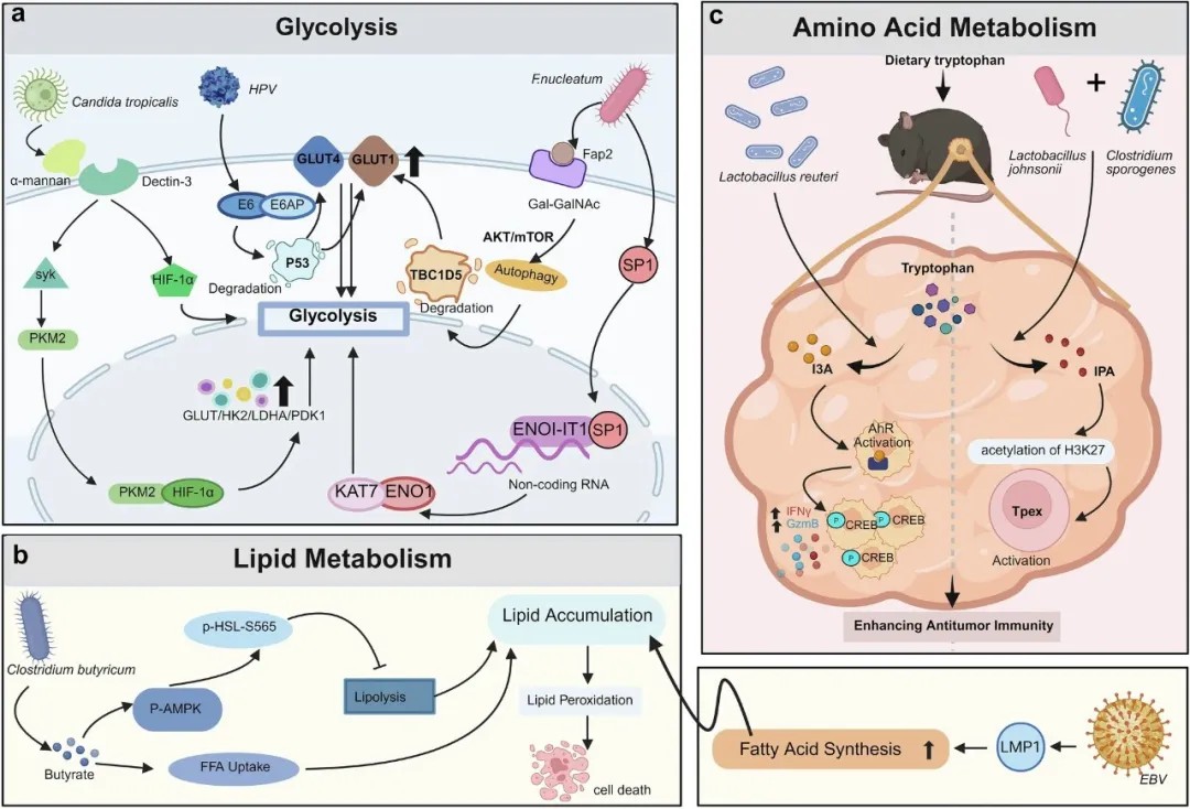 文章强调,微生物群在癌症中扮演双重角色:一方面,特定病原菌如具核梭杆菌、幽门螺杆菌可通过破坏黏膜屏障、激活致癌通路(如β-连环蛋白通路)促进肿瘤生长;另一方面,益生菌如阿克曼菌、海氏肠球菌能增强化疗和免疫疗法疗效。例如,肠道菌群代谢产生的短链脂肪酸可调节免疫细胞活性,而真菌群落(如念珠菌、马拉色菌)与细菌协同作用,影响胰腺癌、胃肠道癌的预后。