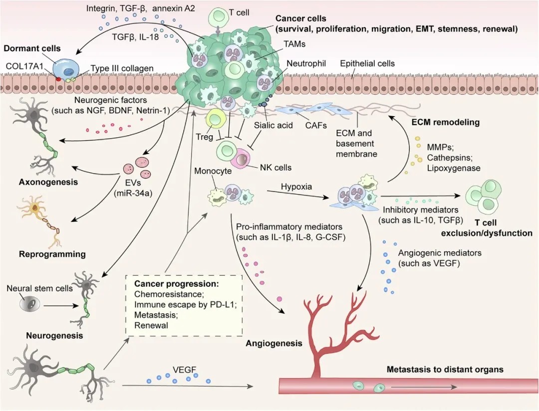 传统上,神经在肿瘤中的作用常被简化为疼痛感知或受压迫的对象。但该综述整合近年的突破性研究指出,神经与癌症之间存在广泛而活跃的“双向对话”。在包括脑瘤、胰腺癌、前列腺癌、乳腺癌等多种实体瘤中,癌细胞会主动招募并包裹神经纤维,甚至诱导新神经生长。