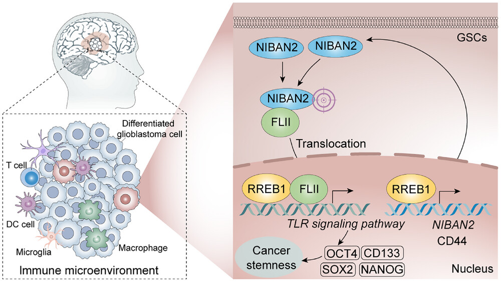 示意图模型展示了 NIBAN2 促进神经干细胞维持及胶质母细胞瘤进展的机制