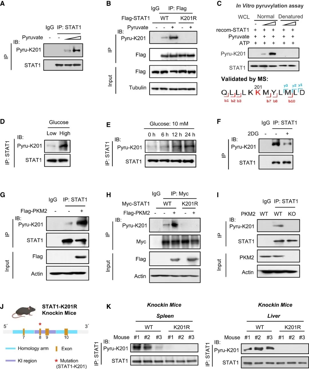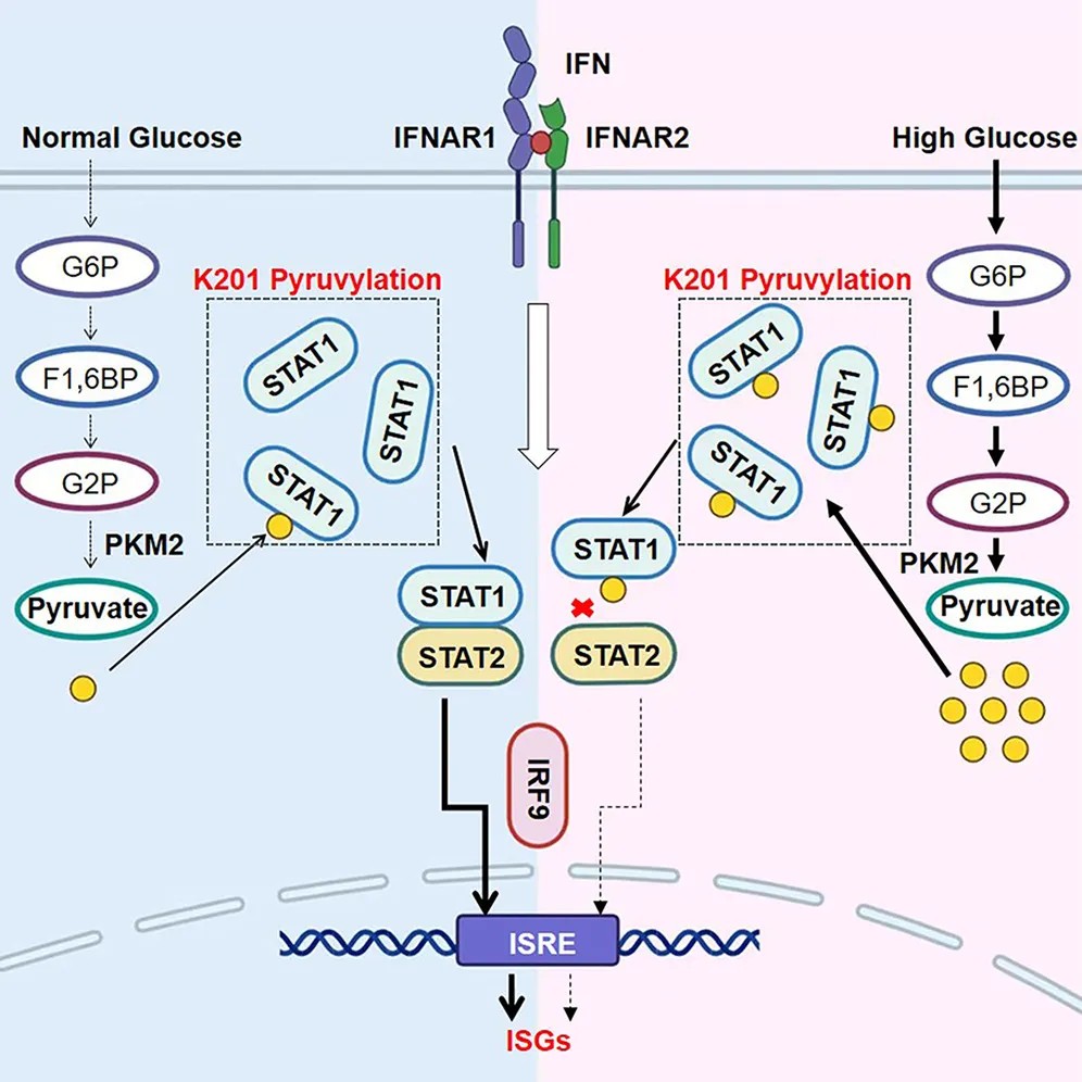 研究团队将目光聚焦于连接代谢与免疫的关键节点。研究团队发现,高血糖环境会上调细胞糖酵解水平,进而促进信号转导与转录激活因子1(STAT1)蛋白第201位赖氨酸(K201)发生丙酮酰化修饰。这种修饰并非偶然,而是由糖酵解关键酶PKM2催化产生的丙酮酸直接介导的。