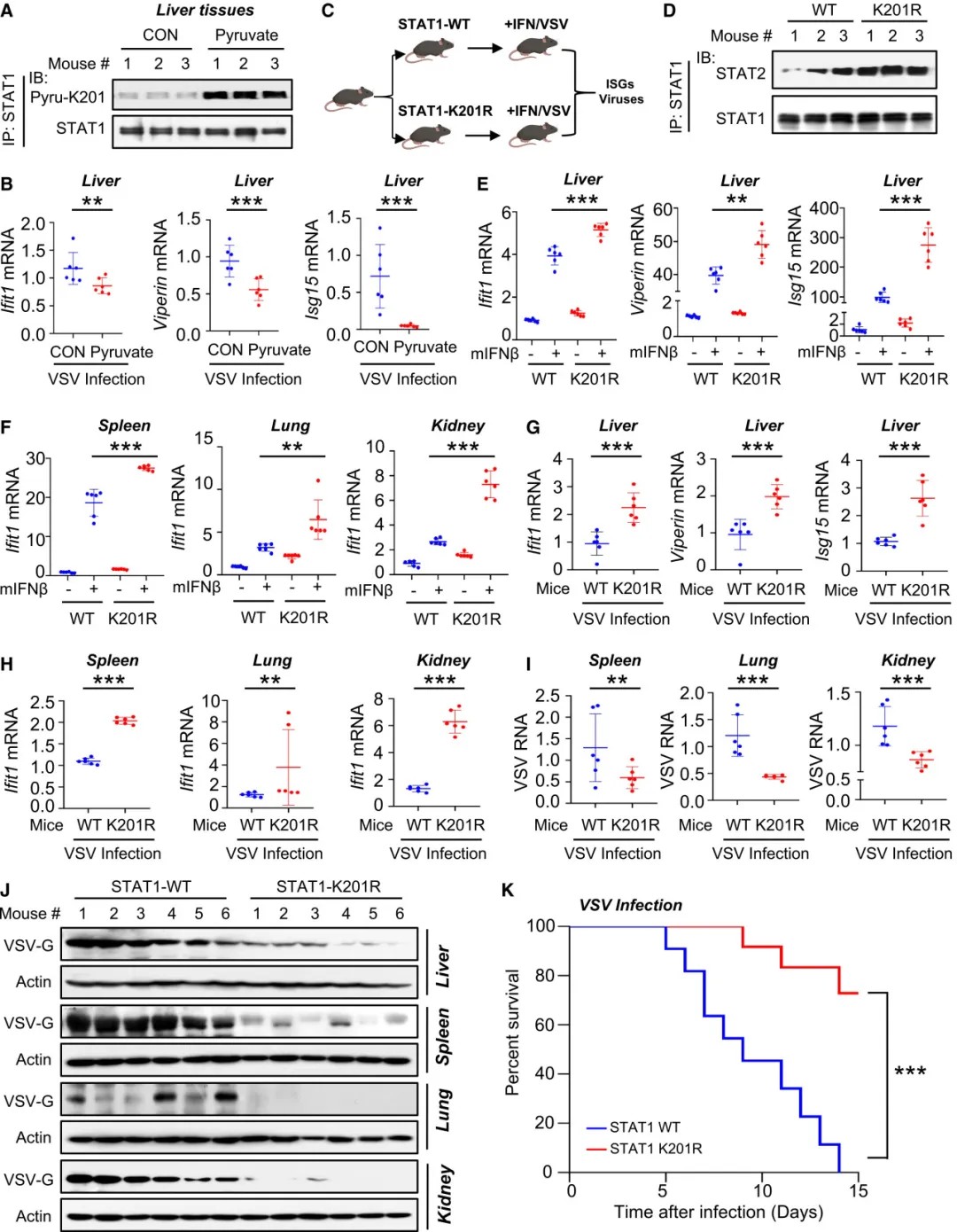 为了验证这一机制在生理和病理状态下的重要性,研究团队构建了STAT1 K201R(模拟无法被丙酮酰化)基因敲入小鼠。与野生型小鼠相比,这些突变小鼠在病毒感染或干扰素刺激下,表现出更强的STAT1-STAT2结合能力、更高的抗病毒基因表达水平、更低的病毒载量以及显著提高的存活率。这直接证明了抑制STAT1丙酮酰化能够增强机体自身的抗病毒免疫防御能力。