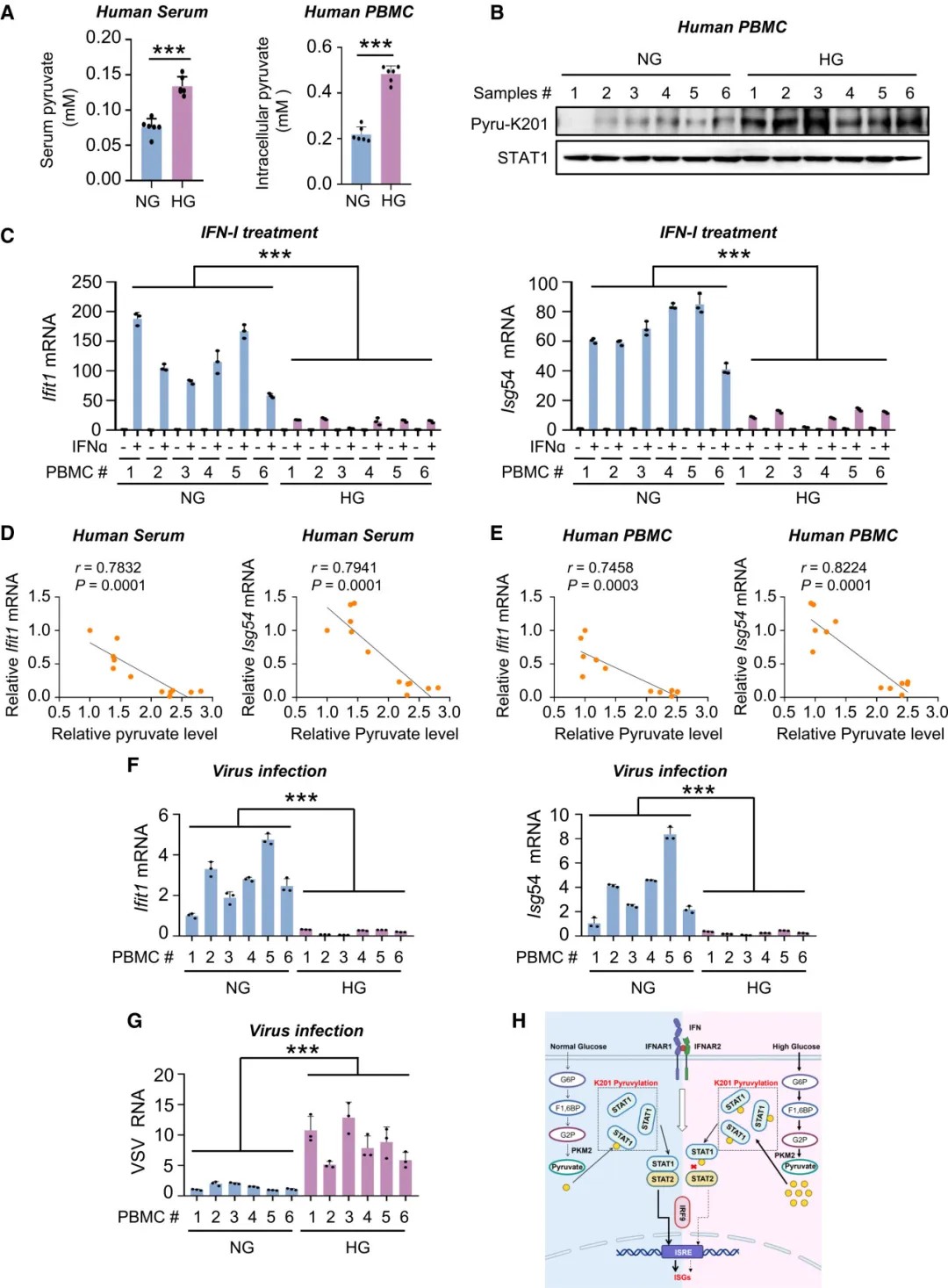 研究人员收集了血糖正常和血糖偏高志愿者的外周血单个核细胞(PBMCs)进行分析。结果发现,高血糖个体的PBMCs中,丙酮酸水平、STAT1丙酮酰化水平均显著升高,而STAT1-STAT2相互作用及干扰素诱导的抗病毒基因表达则被削弱。这些指标在人体样本中的负相关性,强有力地支持了“高血糖→丙酮酸累积→STAT1丙酮酰化→干扰素信号抑制→抗病毒免疫减弱”这条通路在人类免疫系统中同样存在并发挥作用。