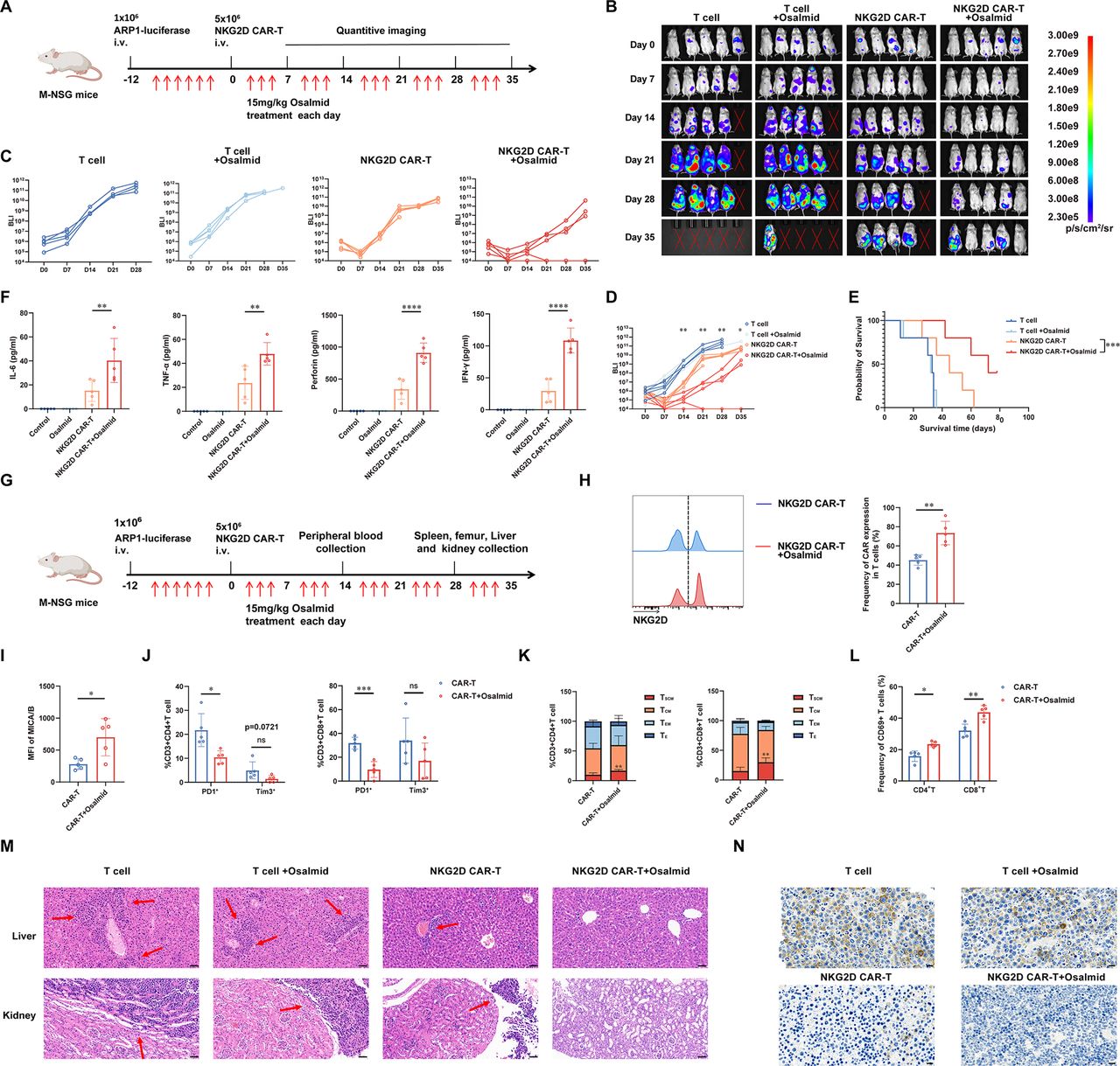 在治疗 1 周后采集血清,发现使用奥沙米特治疗的小鼠体内嵌合抗原受体 T 细胞(CAR-T)扩增以及细胞因子释放(TNF-α、IFN-γ、IL-6 和穿孔素)均有所升高。流式细胞术显示,外周血中多发性骨髓瘤(MM)的 NKG2D CAR-T 细胞扩增显著增加,且 MICA/B 丰度增强。此外,外周血的流式细胞术分析表明,奥沙米特给药显著增加了 NKG2D CAR-T 细胞的比例,降低了 CD4+ 和 CD8+ NKG2D CAR-T 细胞中的耗竭标志物(包括 PD-1)。此外,通过检测 CD69 的平均荧光强度(MFI),发现奥沙米特处理的 NKG2D CAR-T 细胞表现出显著增强的效应功能。对骨髓和脾脏切片进行免疫组化分析显示,与单独使用 NKG2D CAR-T 细胞治疗的小鼠相比,使用奥沙利铂和 NKG2D CAR-T 细胞治疗的小鼠体内 CD138+ 多发性骨髓瘤细胞显著减少。这些发现表明,奥沙利铂在体内增强了 NKG2D CAR-T 细胞的抗肿瘤效力和适应性,为多发性骨髓瘤提供了一种有前景的治疗策略。