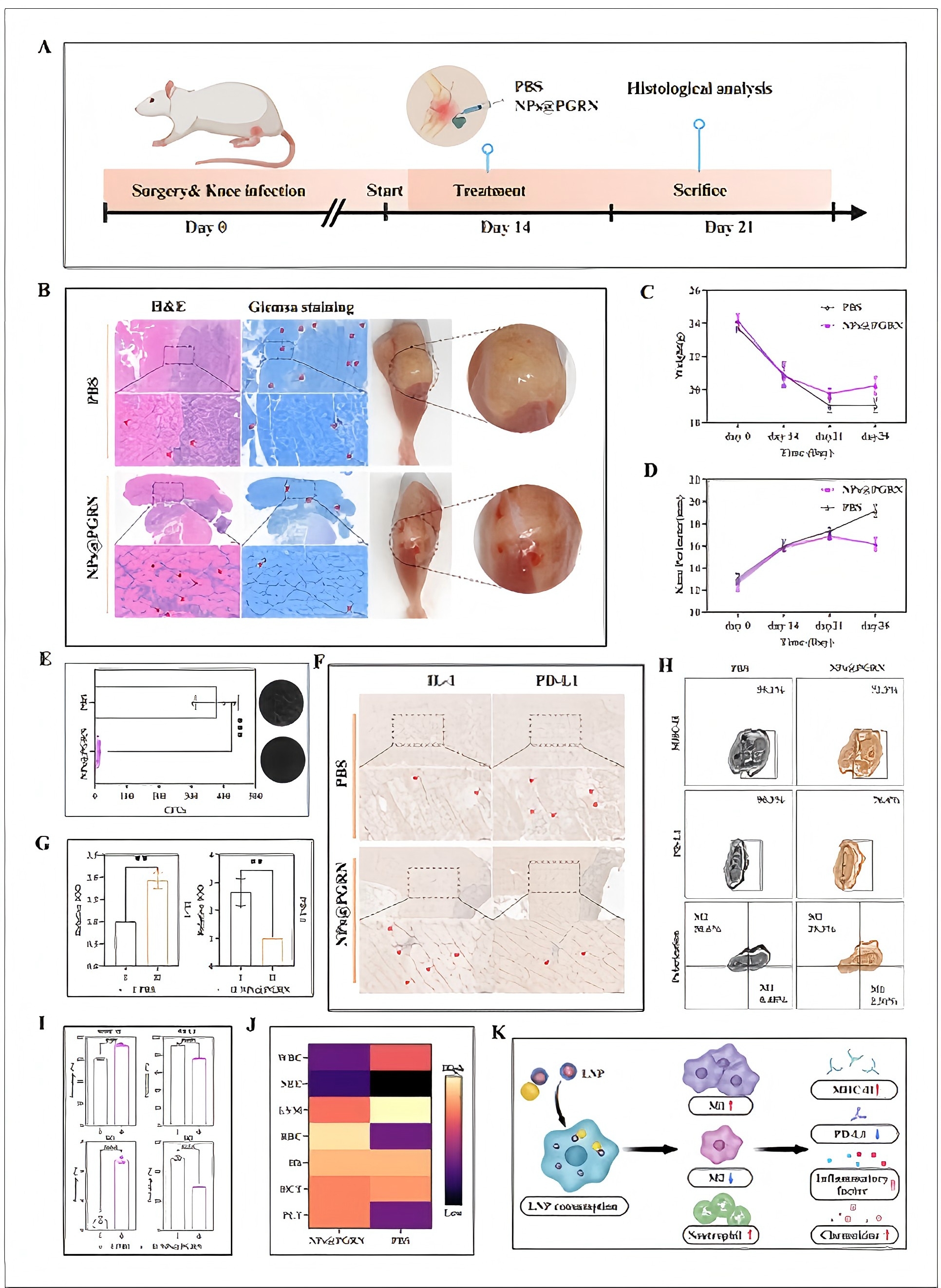 组织病理学分析(H&E 染色)显示两组均有明显的炎症细胞浸润和肉芽肿形成。然而,与 PBS 对照组相比,NPs@PGRN 治疗的小鼠在关节周围组织中表现出显著更多的中性粒细胞募集,这与血液中升高的外周中性粒细胞计数相一致——这是急性感染消退的临床标志。总的来说,NPs@PGRN 治疗显著减轻了感染的严重程度,表现为细菌负荷减少、体重恢复、关节肿胀减轻以及贫血参数改善。对关节周围软组织进行的 CFU 检测证实,治疗组小鼠细胞内细菌的持续存在得到了有效控制。