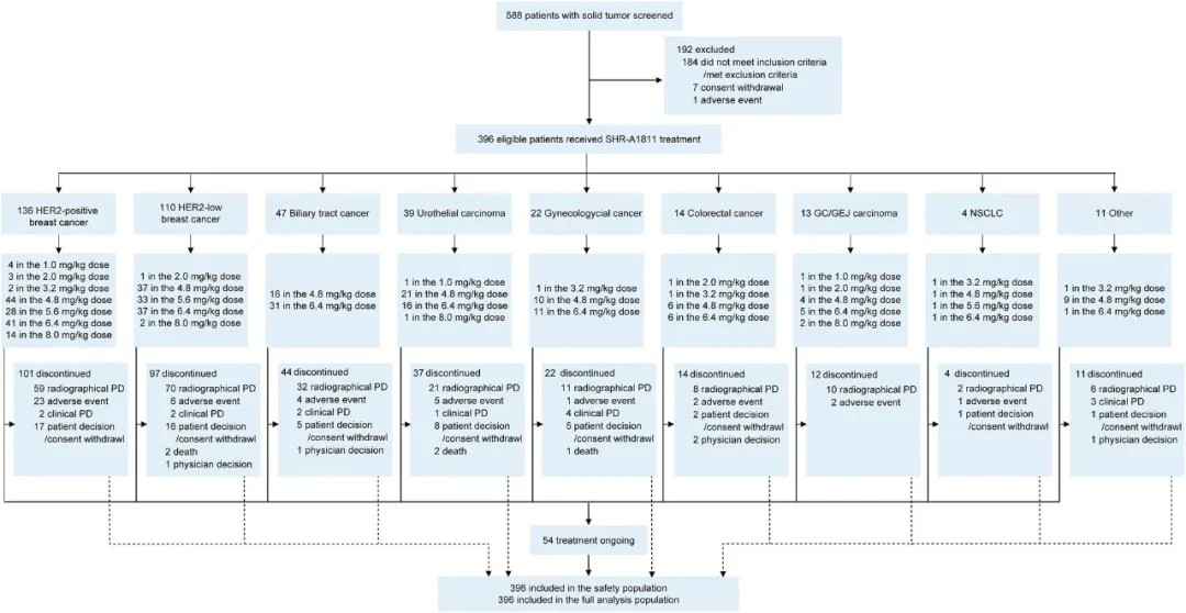SHR-A1811是一种由靶向HER2的抗体曲妥珠单抗、通过可裂解连接子与新型拓扑异构酶I抑制剂有效载荷SHR169265结合而成的新型ADC。本次最终分析数据截至2025年3月12日,共纳入396名晚期实体瘤患者,涵盖乳腺癌、胆道癌、尿路上皮癌、妇科肿瘤等多种癌症类型。所有患者既往接受过中位3线的全身治疗。疗效数据令人振奋: