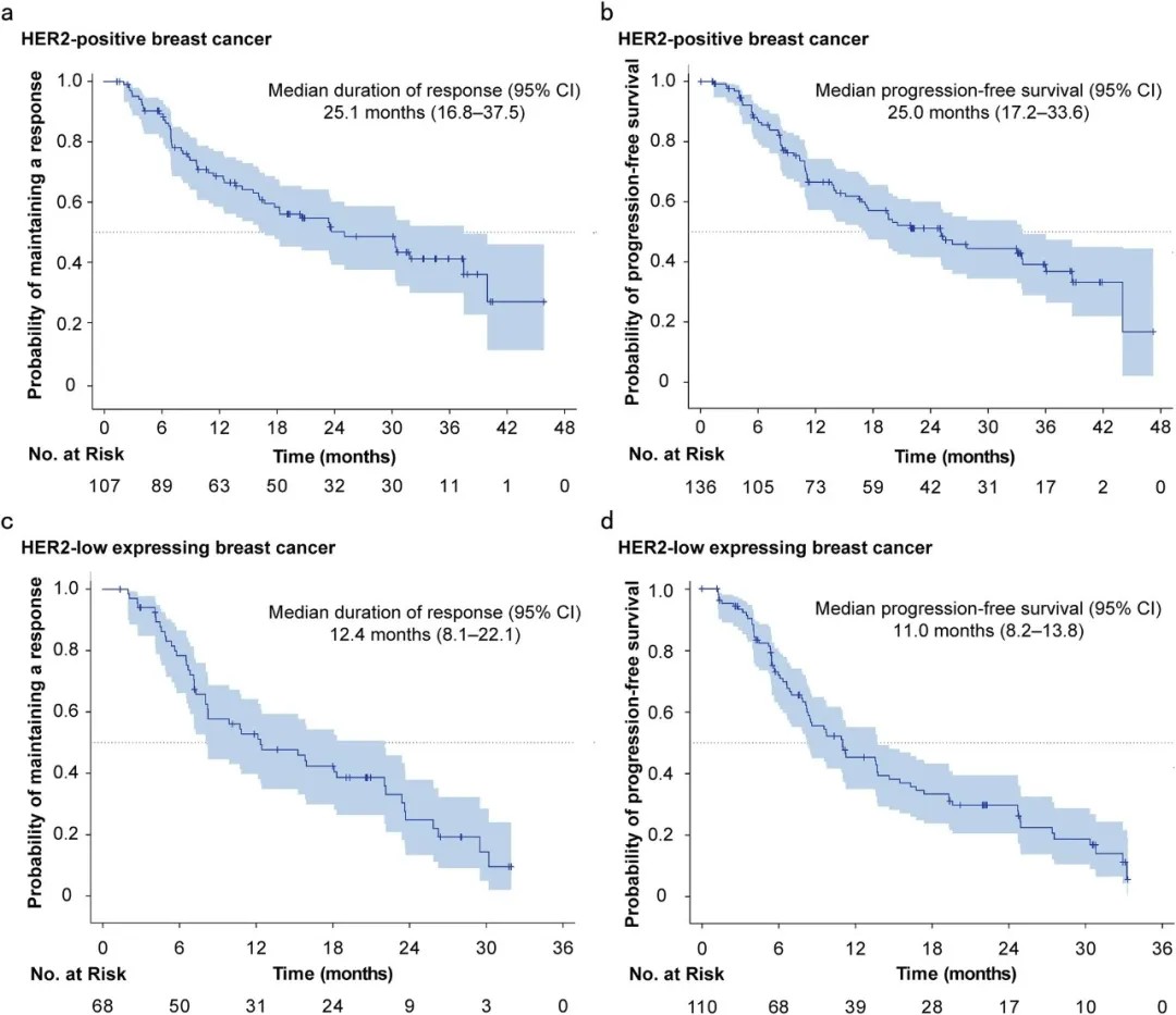 在HER2低表达乳腺癌患者中(n=110),中位无进展生存期为11.0个月,客观缓解率为61.8%。