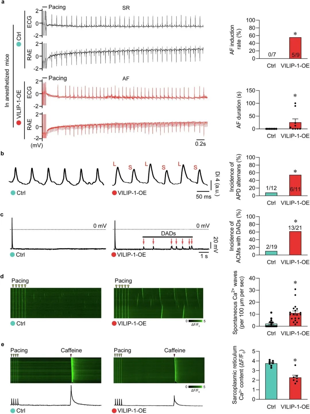 为确认VILIP-1的因果作用,研究团队构建了心房肌细胞特异性过表达VILIP-1的小鼠。结果显示,这些小鼠并未出现心脏结构改变,但房颤诱发率从0%飙升至55.6%,且房颤持续时间显著延长。深入的电生理和钙成像分析发现,VILIP-1过表达会导致心肌细胞出现严重的病理性钙泄漏,进而引发延迟后除极和动作电位时程交替——这两种现象是触发房颤的重要电生理基质。